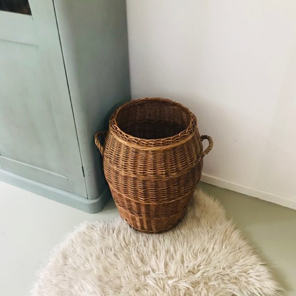 De vintage rotan mand is 56 cm hoog en heeft een doorsnede van 35 cm.