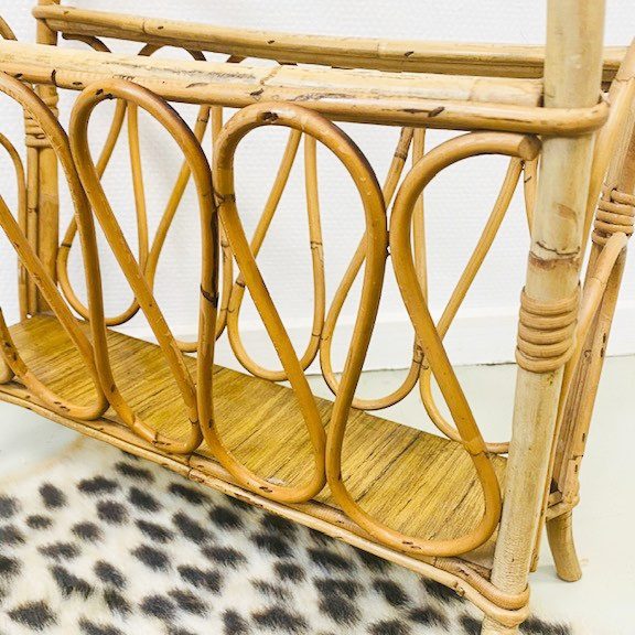 Prachtig vormgegeven lektuurbak in blank rotan rechtstreeks uit de seventies. De lektuurmand is in goede vintage staat en is 42,5 cm lang, 24 cm breed en is 45 cm hoog.